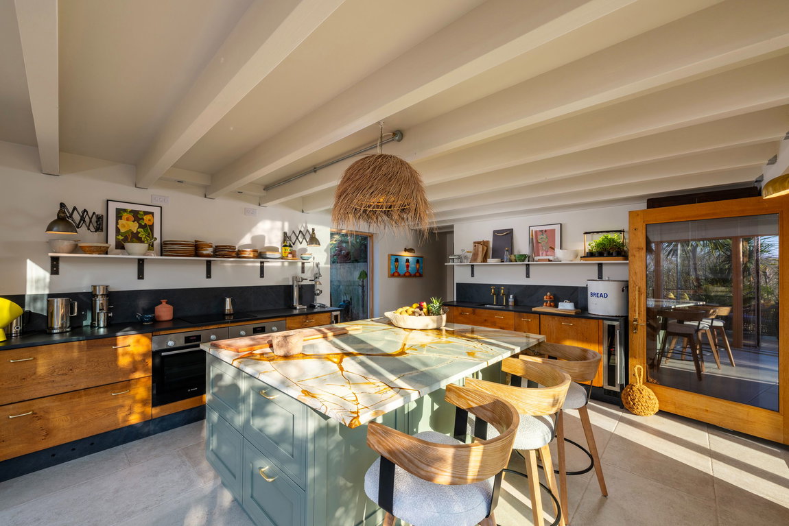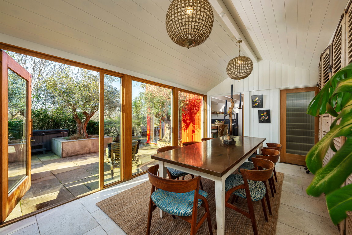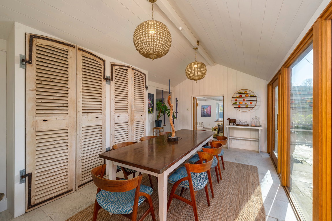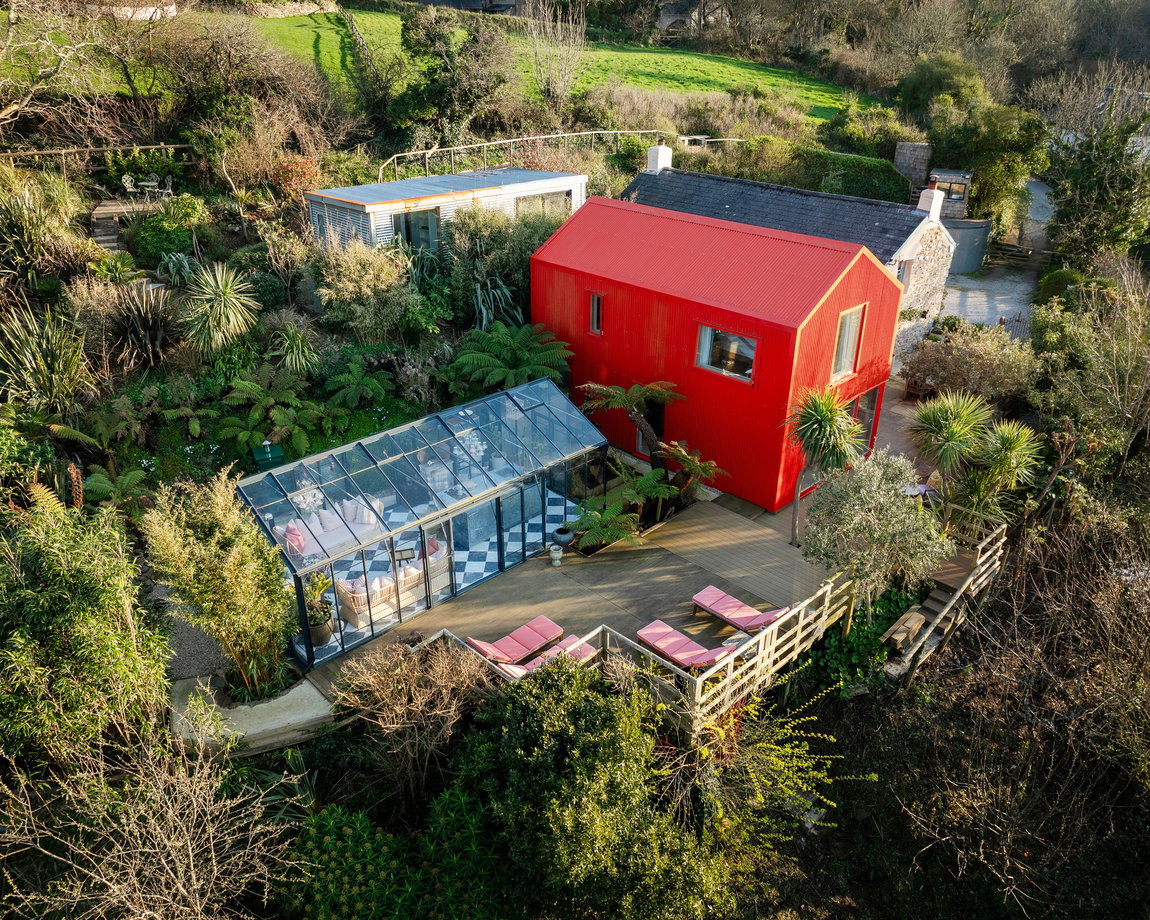 Located in a peaceful woodland setting just inland from Perranporth, and enjoying glorious far-reaching views, this charming cottage has been thoughtfully modernised with a striking and imaginative Scandi-style extension. Set within enchanting and beautifully landscaped gardens of around half an acre, this truly original home has been finished to an exceptional standard, with bespoke and carefully crafted details throughout. Further enhancing its appeal are two studios, a home office, and a remarkable glasshouse-style outdoor kitchen creating a highly distinctive space for entertaining and year-round enjoyment.