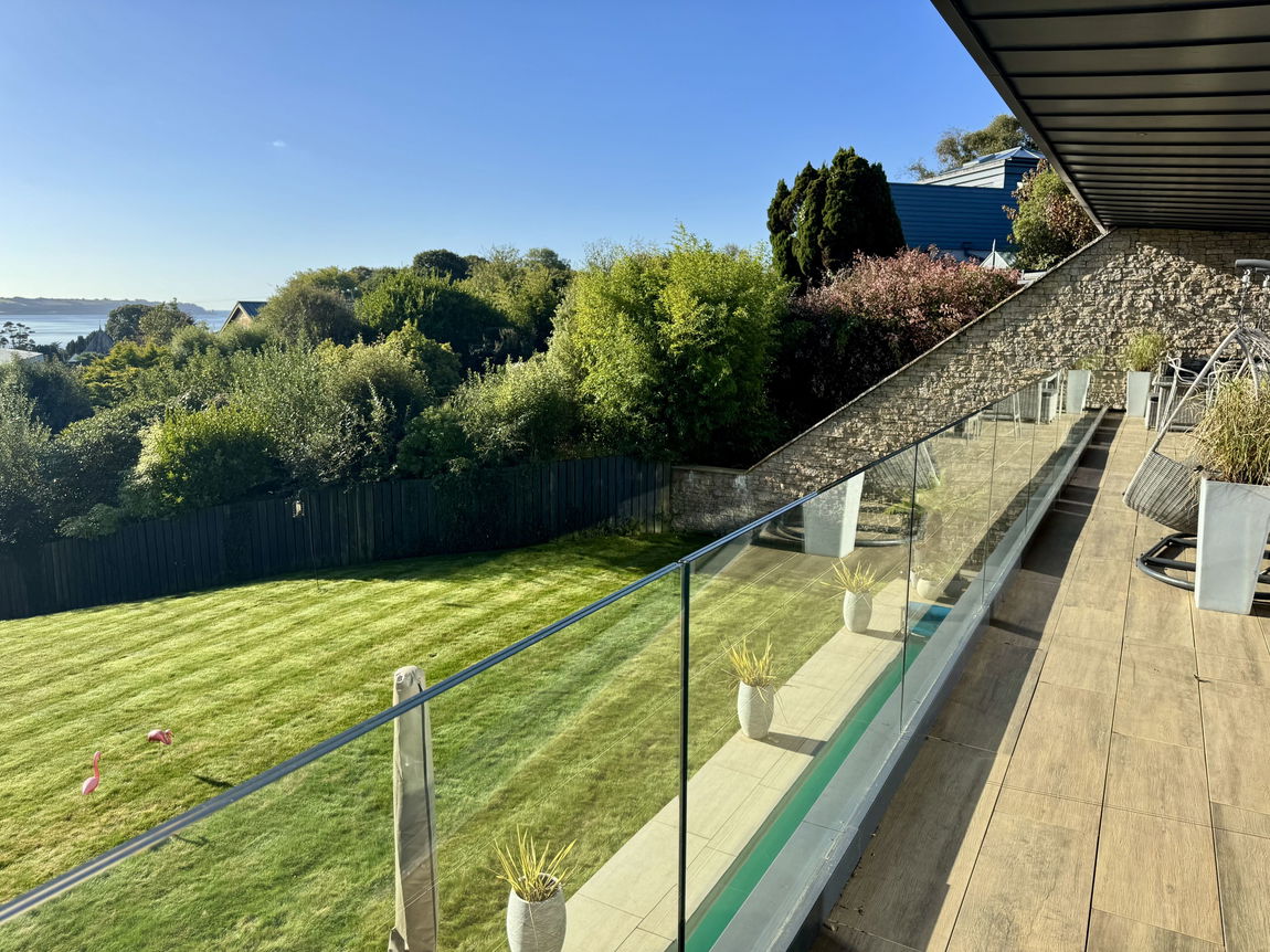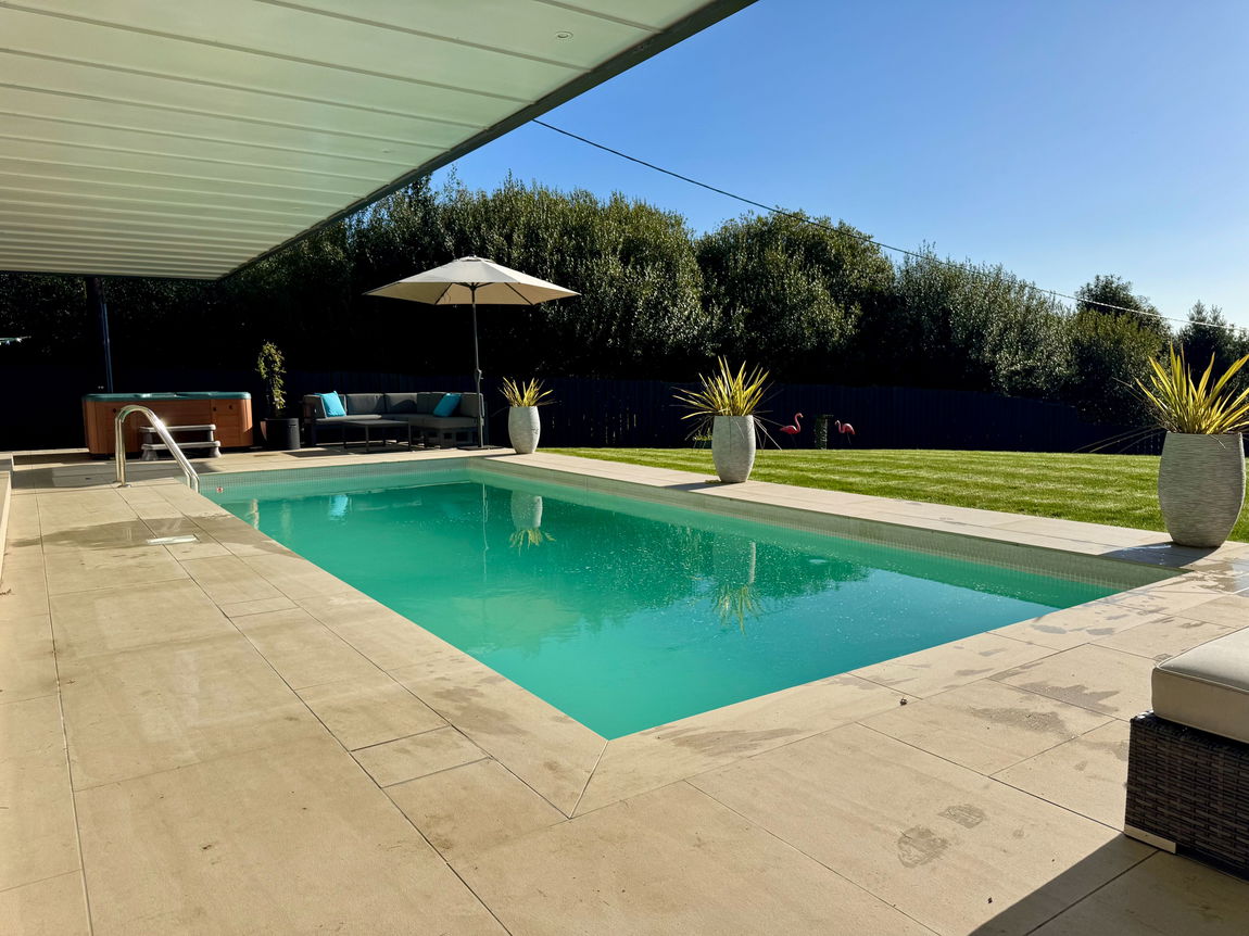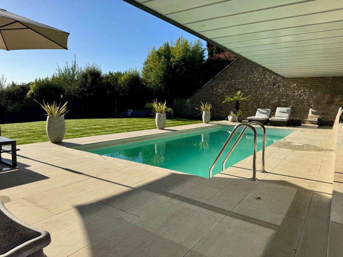 Outside - Long driveway in addition to a double garage, full-width balcony leading from the main living areas, stylish terrace with swimming pool (8.4m x 3.4m), well enclosed and private lawned gardens, plant room, large store