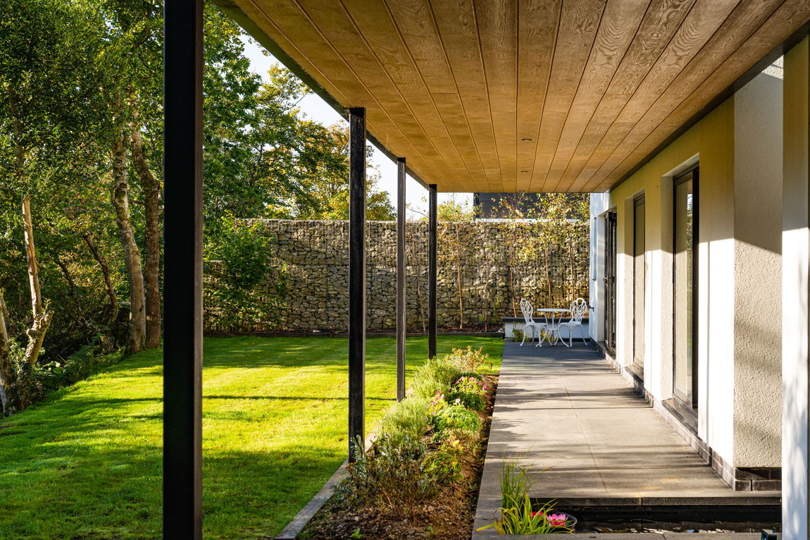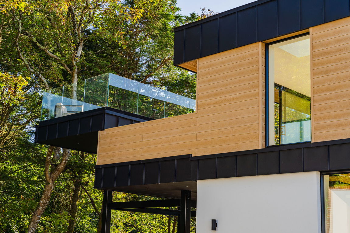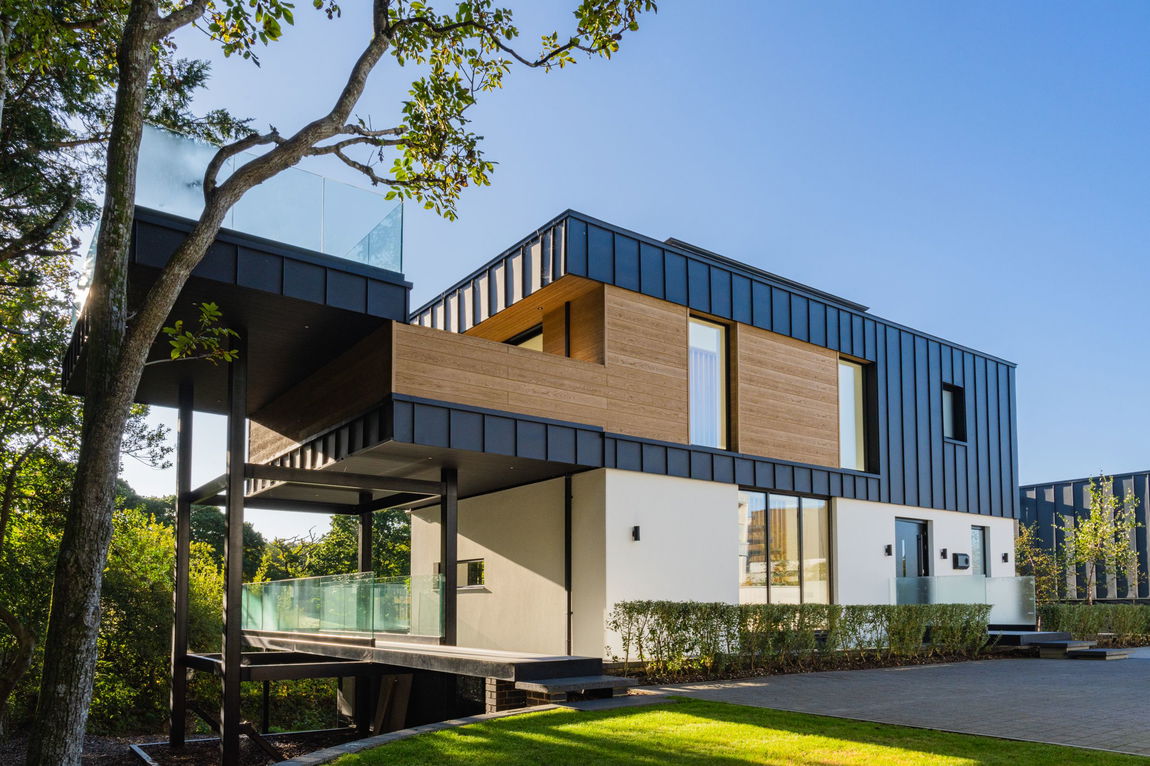 · Silicone white render, standing-seam metal cladding, and Millboard exterior finishes.
