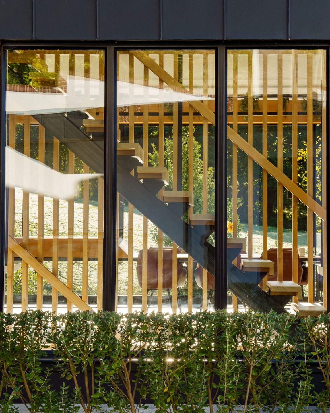· Floating oak staircase with floor-to-ceiling balustrade and integrated LED lighting.